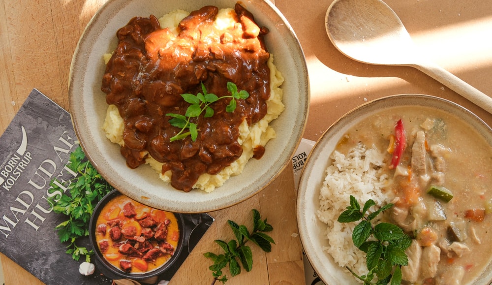 Fyld af klassisk dansk hønsesalat med asparges, serveret med lille grøn sidesalat