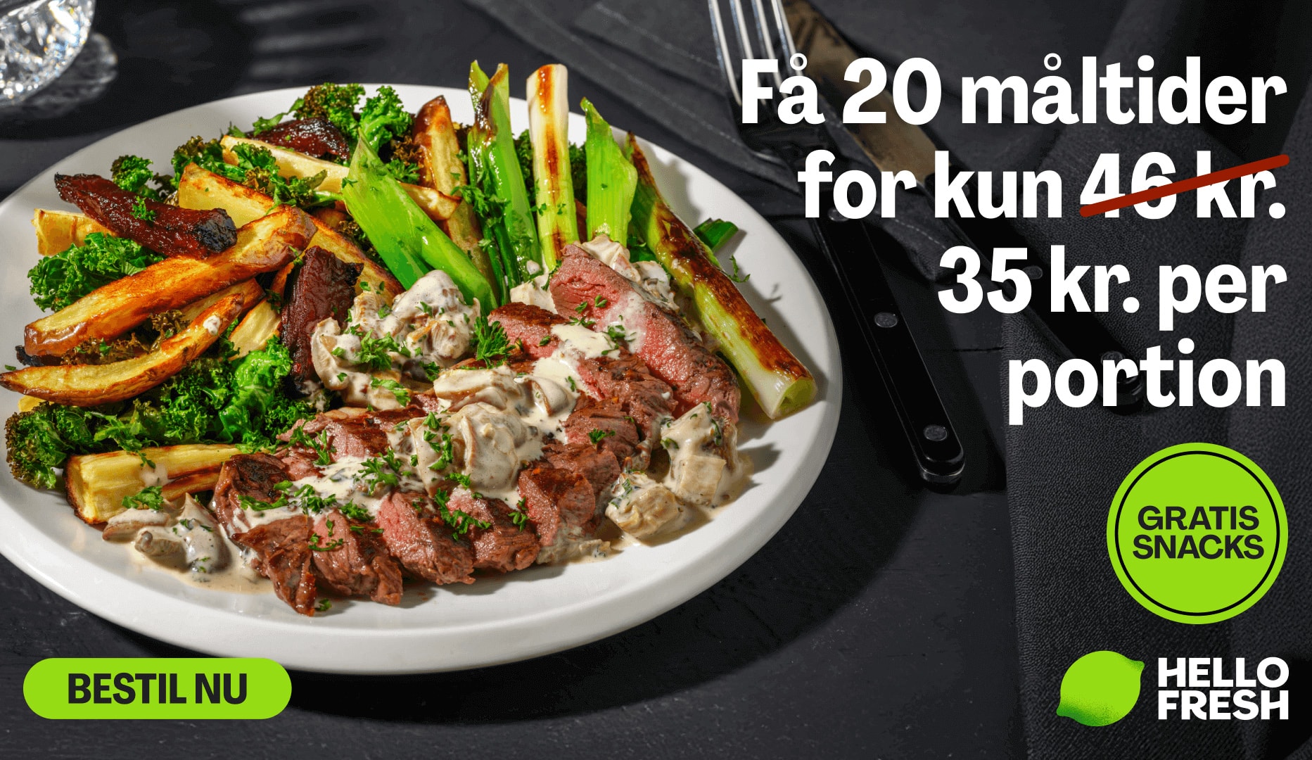 Vilkår: Du sparer op til 479 kr. på dine første 5 kasser. Rabatten fordeles således: Levering 1: 179 kr. rabat, Levering 2: 105 kr. rabat, Levering 3: 65 kr. rabat, Levering 4: 65 kr. rabat, Levering 5: 65 kr. rabat. Tilbuddet giver dig en gratis snack med hver måltidskasse, du bestiller indenfor de første 2 måneder, så længe du forbliver kunde hos HelloFresh og ikke opsiger dit abonnement i perioden. Rabatten kan ikke bruges på Specialopskrifter, tillægsprodukter og levering. Hvis ikke der bestilles 5 kasser inden 9 uger, går den resterende del af rabatten tabt. Tilbuddet gælder kun nye kunder, og kunder, som har haft et inaktivt abonnement i mindst 12 måneder. Rabatkoden kan ikke kombineres med andre tilbud og kan kun bruges én gang pr. ny kunde og/eller husholdning. Koden kan kun bruges af kunder, der bor i Danmark, og i de dele af landet, HelloFresh leverer til. Dine gratis snacks tilføjes ikke automatisk din ordre, men skal aktivt tilvælges. Mængden af snacks vises ved bestilling og afhænger ikke af størrelsen på din måltidskasse. Snacks leveres ud fra tilgængelighed og tager ikke hensyn til kostpræferencer. HelloFresh forbeholder sig retten til at erstatte med et alternativt produkt, hvis den valgte vare ikke længere er tilgængelig. Ved aktivering af rabatkoden tilmeldes kunden et ugentligt abonnement hos HelloFresh. Abonnementet kan til enhver tid sættes på pause eller opsiges. Se alle vilkår på: www.hellofresh.dk/about/termsandconditions.