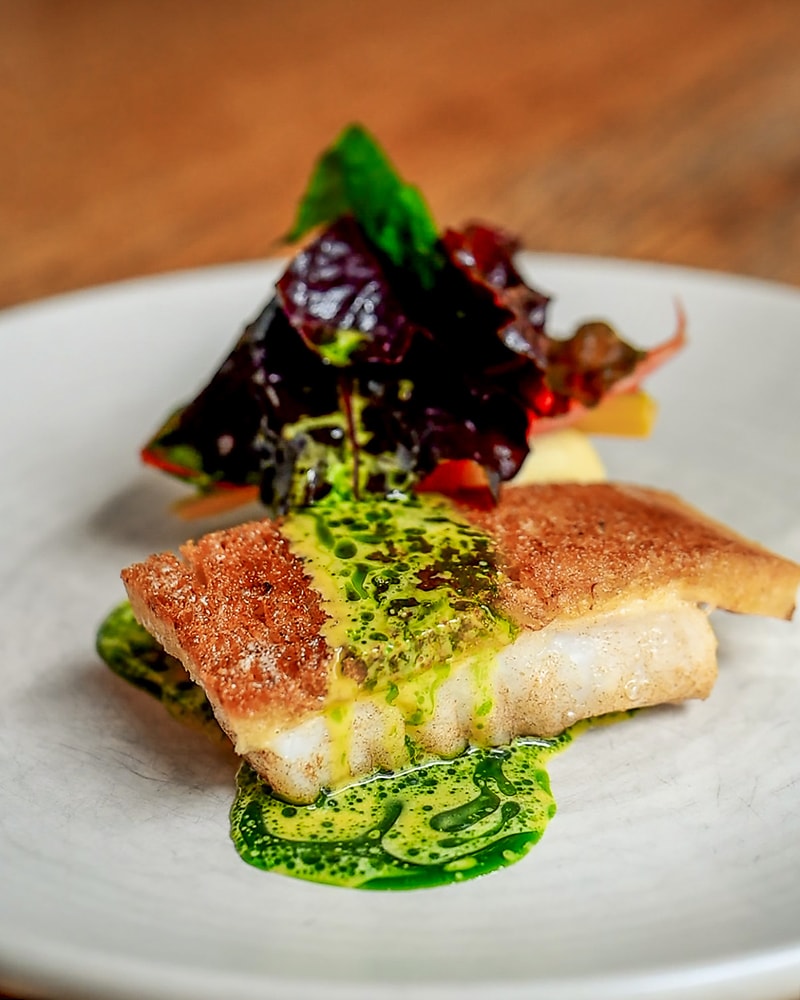 Dagens fangst på crouton med pommes pure, dampede bladbeder og sauce på blåmuslinger og khao soi