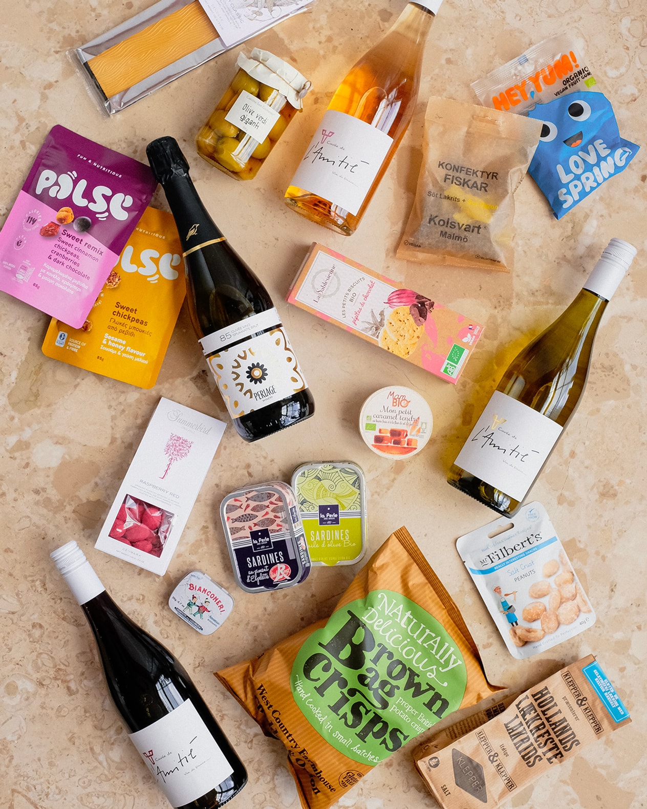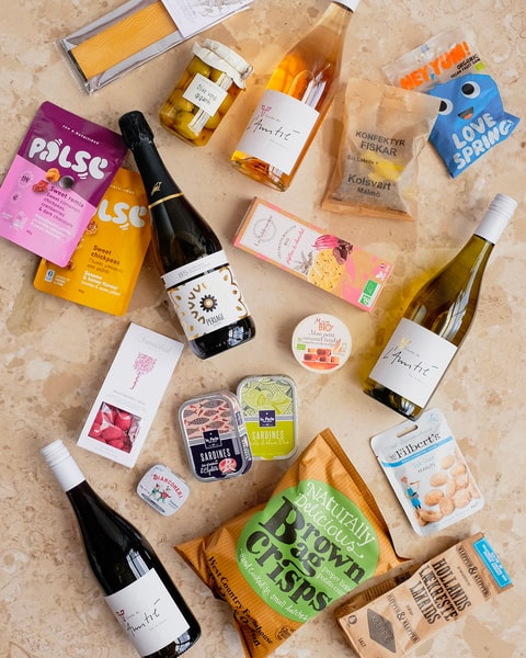 Kasserne indeholder et udvalg af delikatesser, vin, chokolade, oliven, snacks og meget mere...