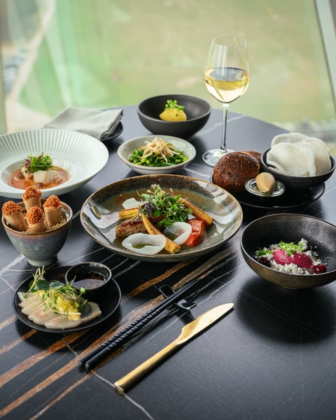 Her indledes rejsen med delikate serveringer som hiramasa med blodappelsin og thaibasilikum samt rejetatar løftet af sake og sesam, inden grøntsager og havets elementer fortsætter fortællingen i lette, syrlige og umamirige kompositioner. Undervejs brydes de fine toner af nybagt shokupan med pisket smør, før hovedretterne sætter dybde og varme på oplevelsen – fra havtaskekæber i aromatisk laksa til saftig landkylling med Szechuan-peber og shoyu. Finalen afrundes med en frisk og aromatisk dessert, hvor tapioka, mandarin og citronverbena smelter sammen i en let og elegant afslutning.