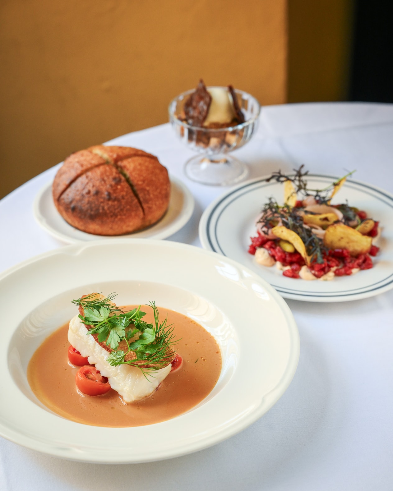 Den 4-retters frokostmenu er en let og indbydende oplevelse, hvor forårets råvarer får lov at folde sig ud i elegante serveringer. Menuen er sammensat med respekt for det franske køkkens traditioner, men tilført et nordisk præg, der giver retterne et friskt og nutidigt udtryk.