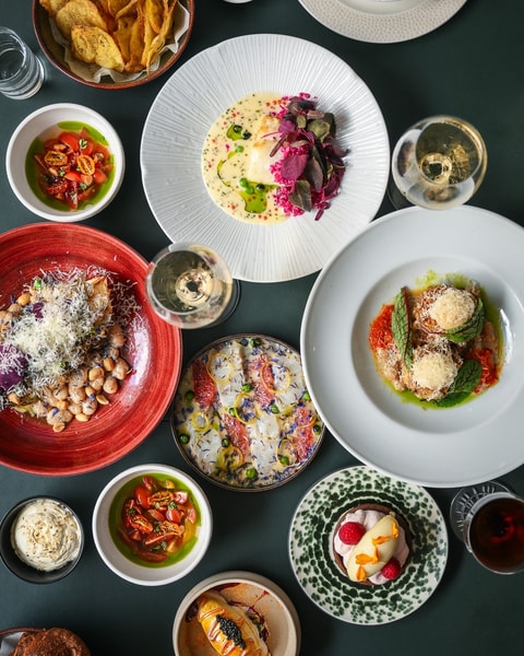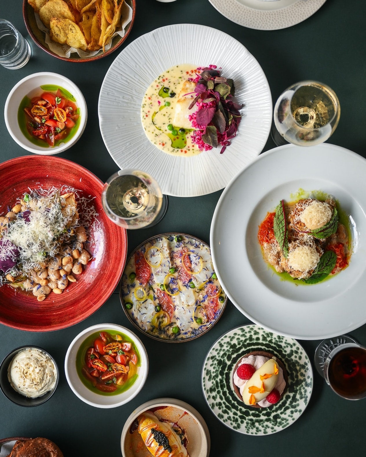 Aftenen åbner med en række delikate snacks – hjemmelavede chips, østers med chimichurri, vindruer og hyldeblomst samt lune popover-brød med brændt smør og kefir sætter tonen. Herefter følger en varieret servering af sæsonens retter: vilde tomater med labneh, sprød chili og sumak-solsikker, grillede padrons med piment aioli og Vesterhavsost samt en elegant crudo med dashi-kærnemælk, ørredrogn og pomelo. Dagens fisk serveres med hummus, muslingesauce og fenikkel crudité, mens bagt blomkål afrunder det salte med chimichurri og dukkah – en menu båret af præcision og kærlighed til råvaren.