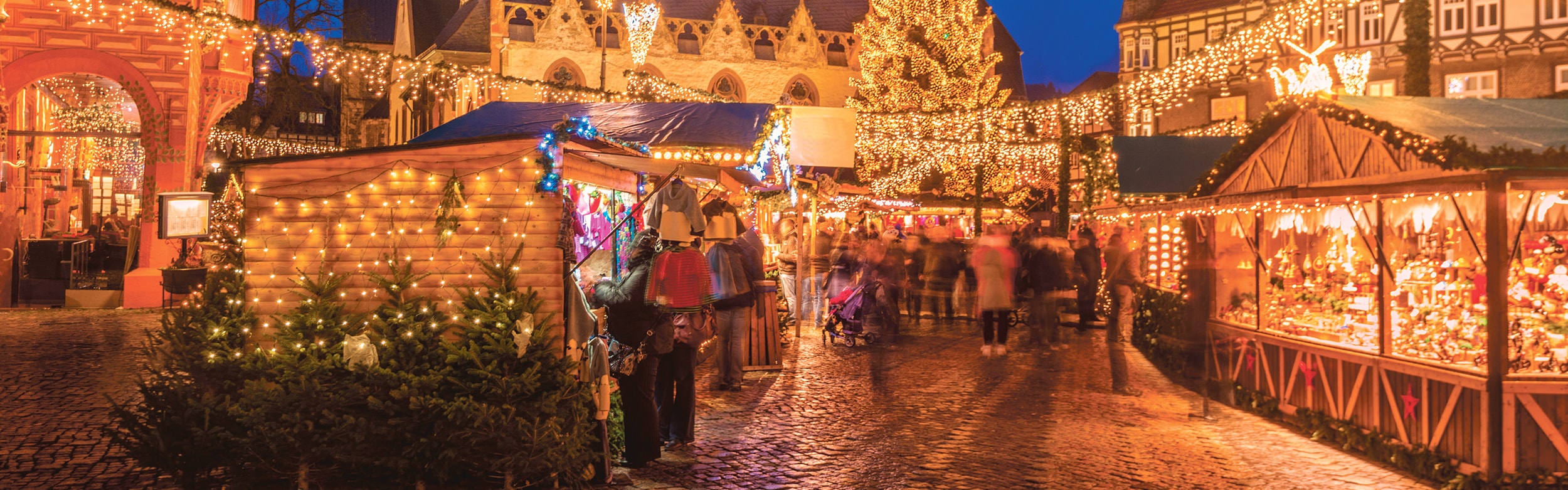 Traditionelt julemarked: I byens centrum finder du klassiske juleboder med kunsthåndværk, gaver og lokale delikatesser.