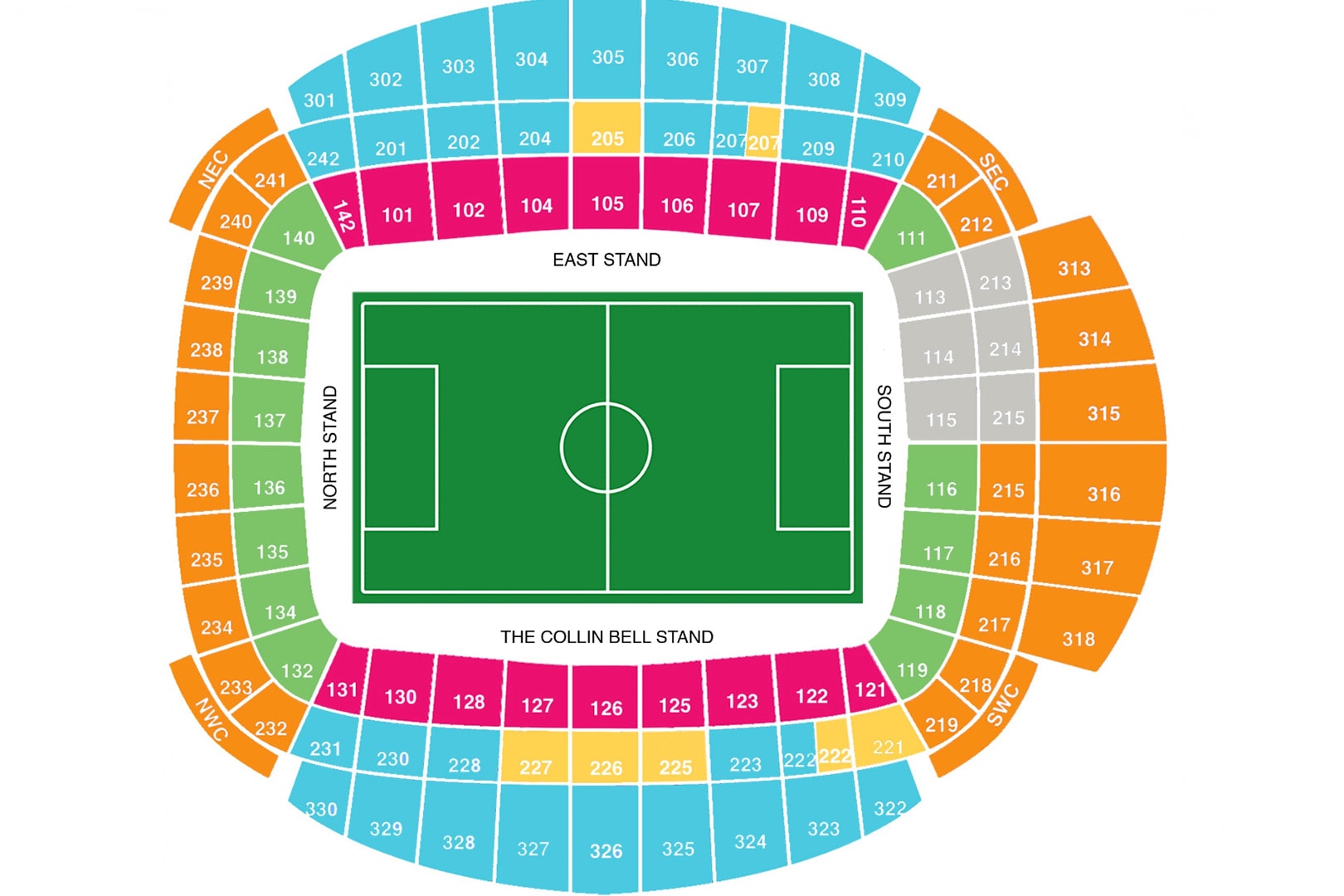 Nedenfor kan i se en oversigt over pladserne på stadion. Kampbilletterne vil være til det orange område.