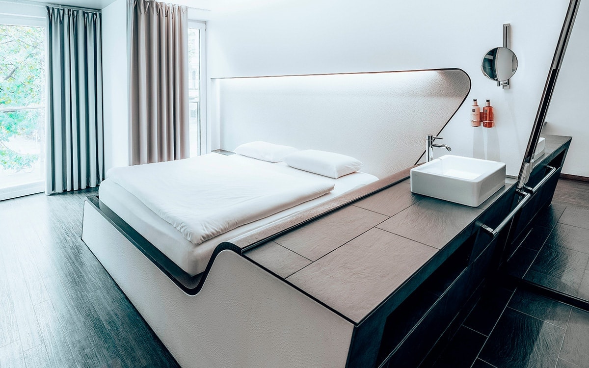 Hotel Q! ligger på en sidegade til Berlins berømte shopping-boulevard Kurfürstendamm. Det eksklusive, 4-stjernede designhotel tiltrækker både internationale berømtheder og lokale trend-skabere. Hotellet har vundet adskillige priser for sit futuristiske design, der kombinerer minimalistisk æstetik med formfuldendt elegance. Den røde lobby og loungen har et nærmest gyldent skær, og spa-området er holdt i jord- og sandfarver.