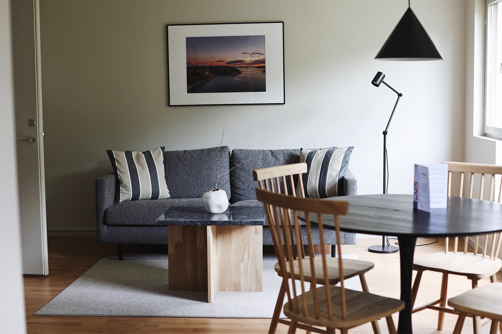 Efter en dag med skønne aktiviteter kan I slappe af i jeres egen lejlighed, som er dejlig og rummelig på hele 48 kvm. Lejligheden er udstyret med to soveværelser: et med to enkeltsenge, der er samlet, men som nemt kan skilles ad, hvis det ønskes, samt et soveværelse med en køjeseng. Derudover har I en stue med spiseplads, badeværelse og køkken.