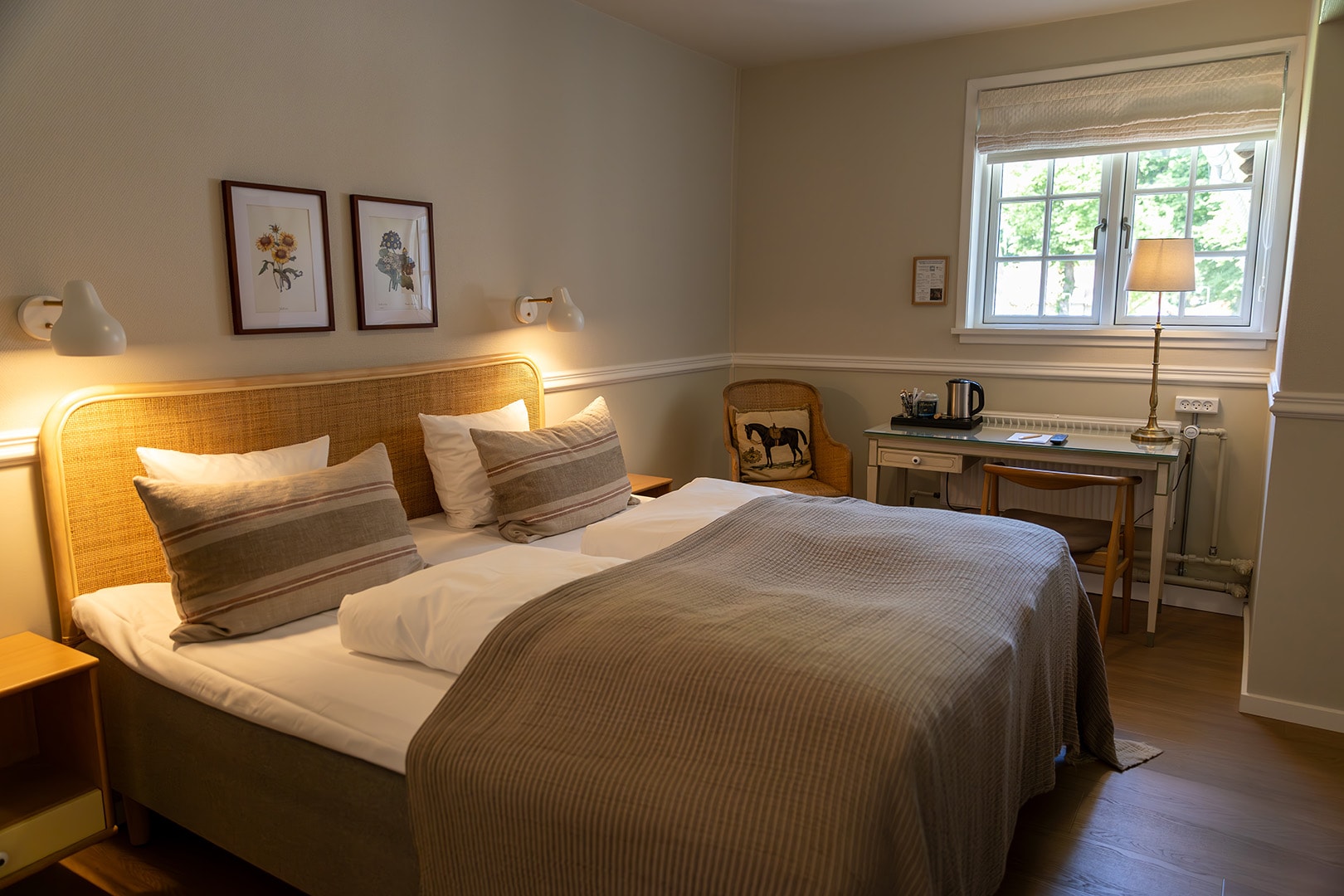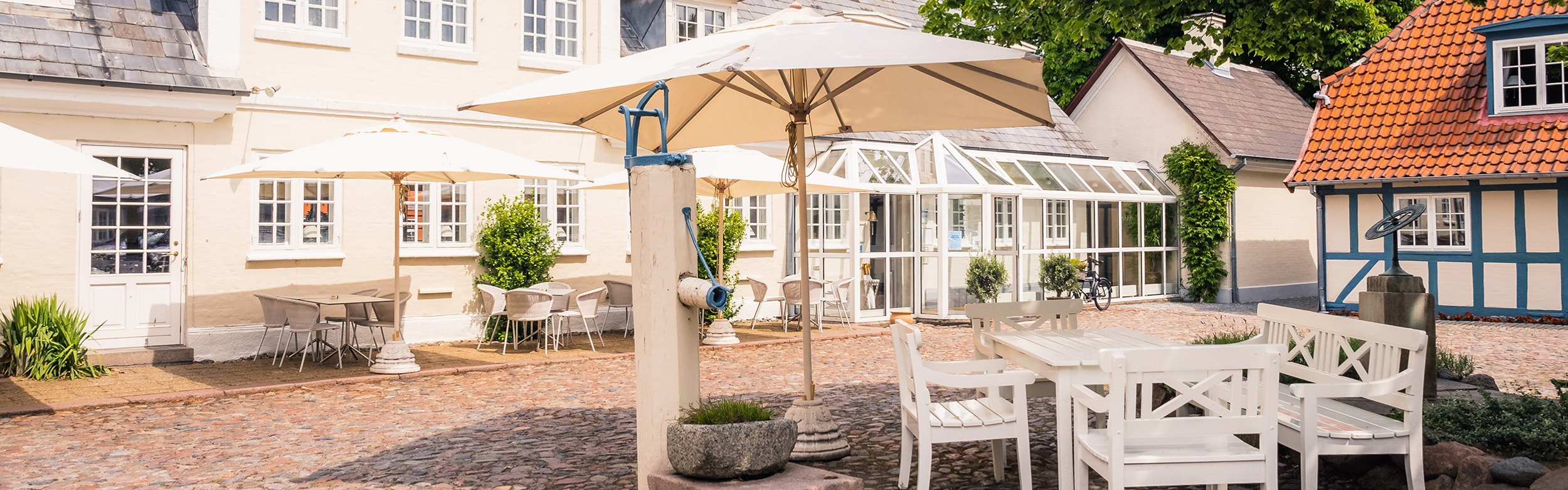 Midt i byen – men helt væk fra støjen. Den brostensbelagte gårdsplads, bindingsværk og den landlige ro får dig til at føle, at du befinder dig på en idyllisk herregård, selvom centrum ligger blot to kilometer væk.Nyligt renoverede værelser med nordisk elegance