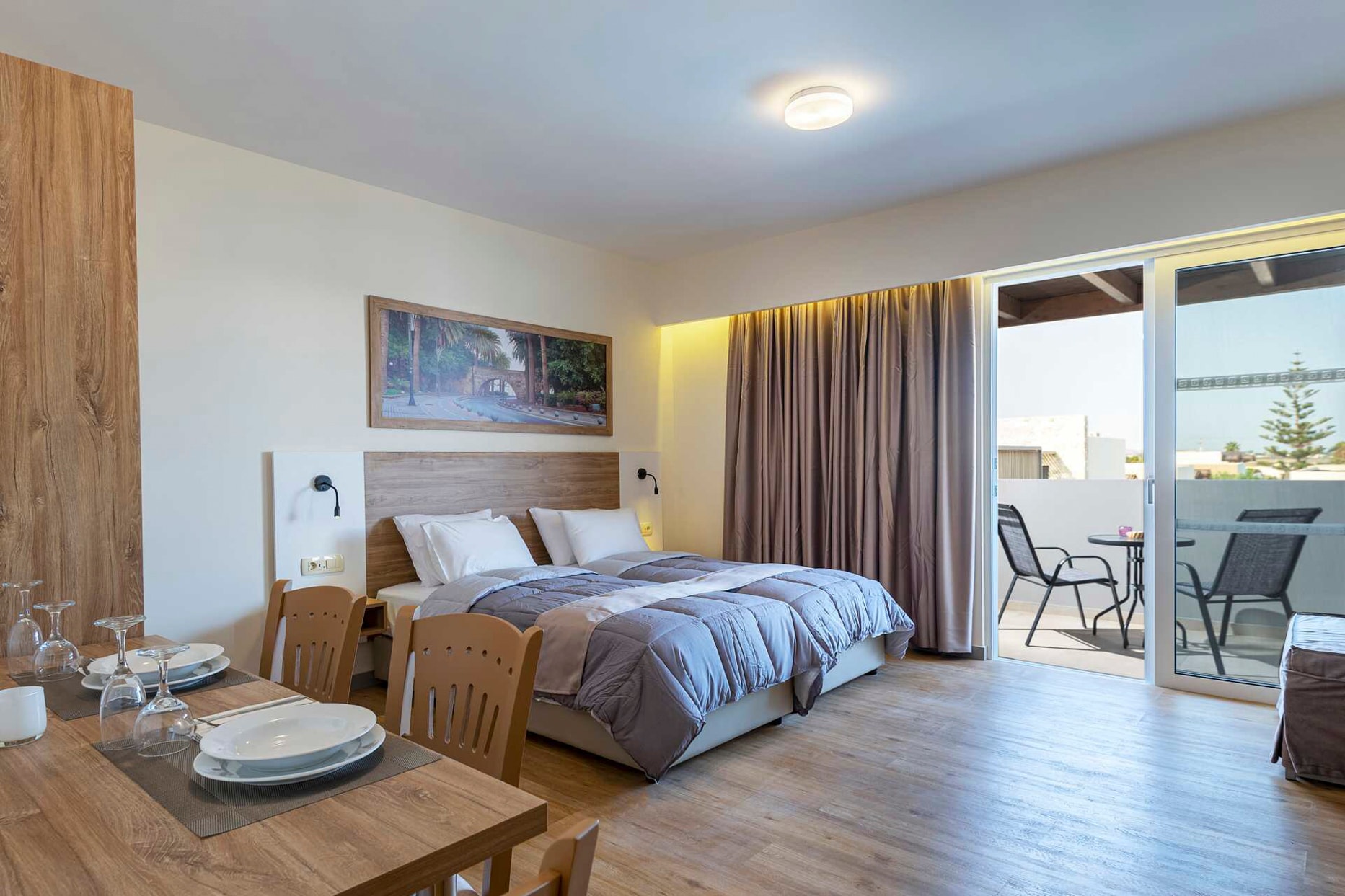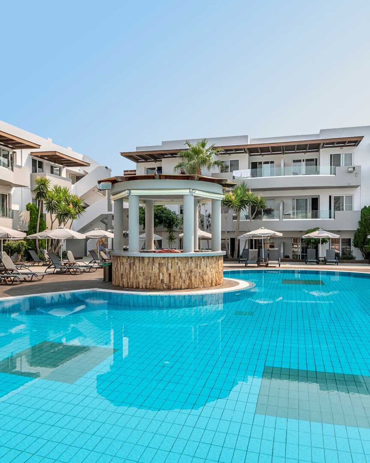 Pelopas i Tigaki emmer af ægte græsk charme og familiær atmosfære. Her bor du centralt i hyggelige omgivelser med kort afstand til både den indbydende sandstrand og byens livlige udvalg af restauranter, barer og små butikker. Hotellet er familiedrevet gennem generationer, og den varme gæstfrihed mærkes overalt – fra den personlige velkomst til de smukt indrettede fællesområder med detaljer inspireret af græsk kultur og historie.